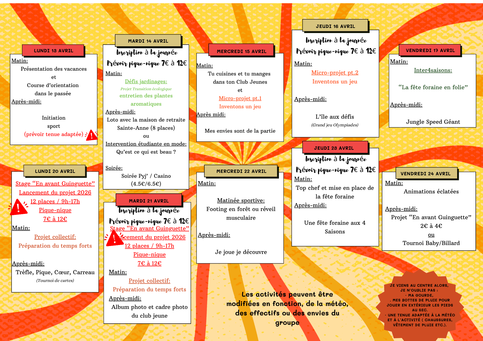 Vous trouverez ci-dessous les liens pour les inscriptions des vacances de printemps 2026.
